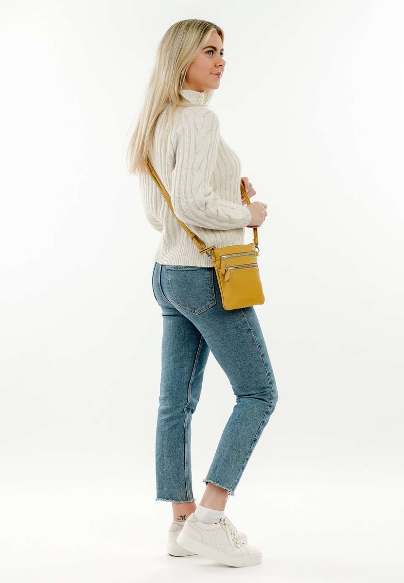 Näppärä laukku on käytännöllinen kokoisekseen: Edessä 2 vetoketjutaskua ja lisäksi sisällä vielä yksi vetoketjutasku sekä kolme korttipaikka, joten voit vaikka jättää lompakon kotiin. Laukku on riittävän tilava isollekin puhelimelle, laukun korkeus on 19cm.