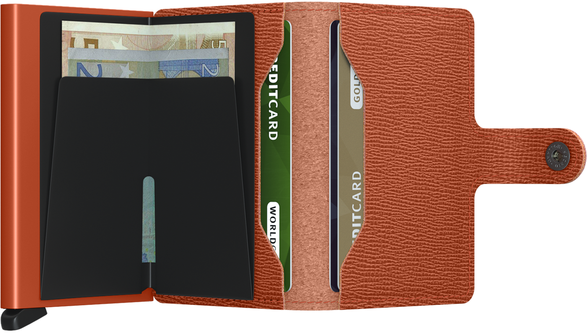 “Vain painallus, ja kortit nousevat esiiin!” Myyntihittimme jo vuosia, ei ihme. Äärimmäisen pieni ja laadukas. Yhdestä alumiinikappaleesta tehty runko, ja vain parasta nahkaa. Tyylikäs ja kestää vuosia. Ja se pääidea? Kortit koteloon, lisäkortteja nahkataskuihin, setelit/kuitit omaan osastoon. Jos joitakin kolikoita, keskimmäiseen nahkaiseen korttitaskuun, näin ne eivät tipu avattaessa. Nahka antaa myöden. Ja sitten lompsa kiinni. Kun maksat kortilla, painat vain napista: Kortit nousevat! Antaa myös RFID-suojan lähimaksukorteille. Ahh, niin ihana että harva ikänä vaihtaisi perinteiseen lompakkoon!