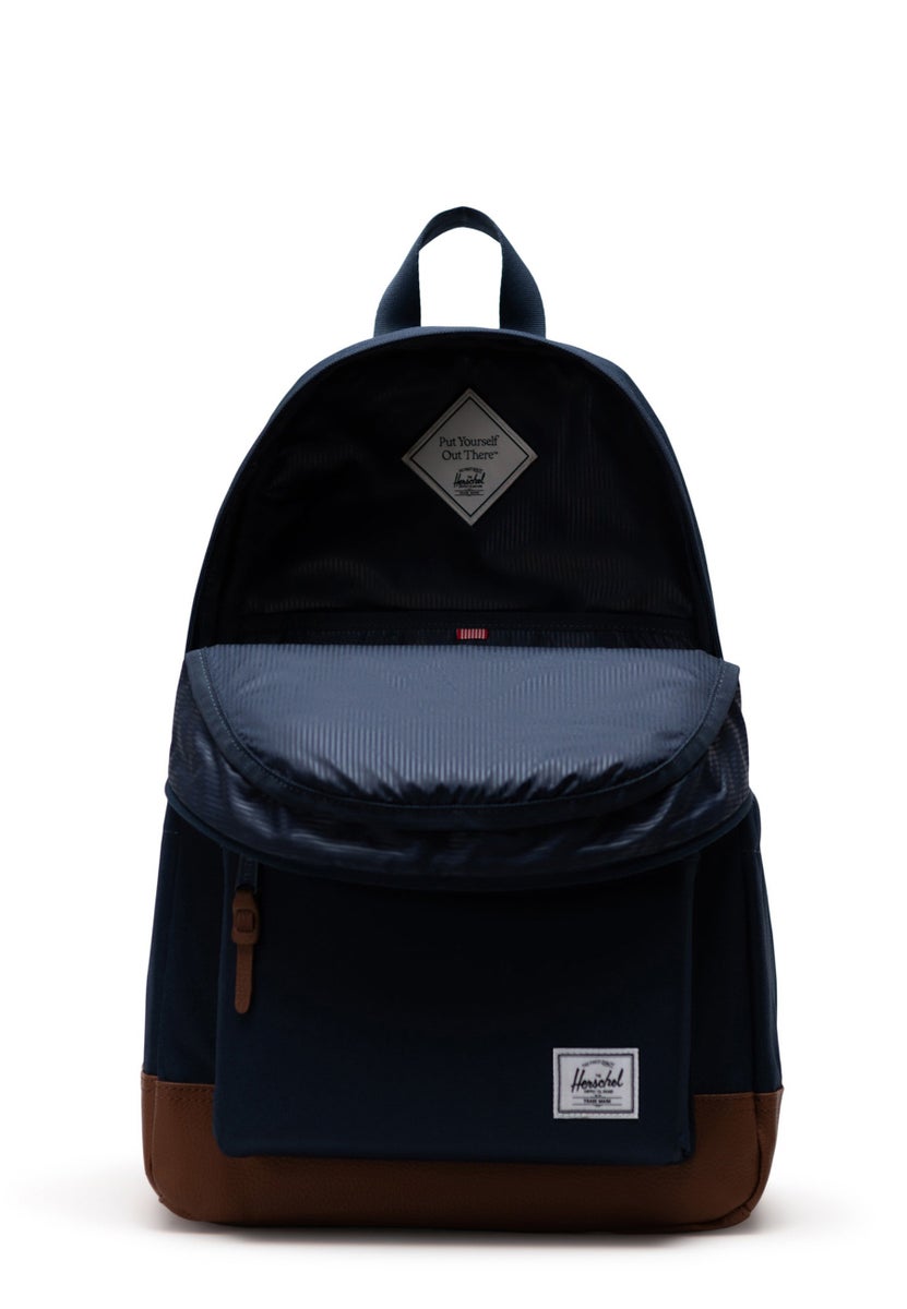 Herschel Heritage on klassinen selkäreppu lisättynä Herschelin ikonisella nahkapala-yksityiskohdalla repun edessä. Tiesitkö että alunperin tämä timantin muotoinen kaunis yksityiskohta oli aikoinaan tarkoitettu vuoristorepuissa jäähakun kiinnitykseen? Nahkapalat ovat Herscheleissä kestävää synteettistä materiaalia ja repun kuosista riippuen joko keinonahkaa (polyurethan) tai kumia/muovia, ja toki niihin edelleen voi kiinnittää asioita!
