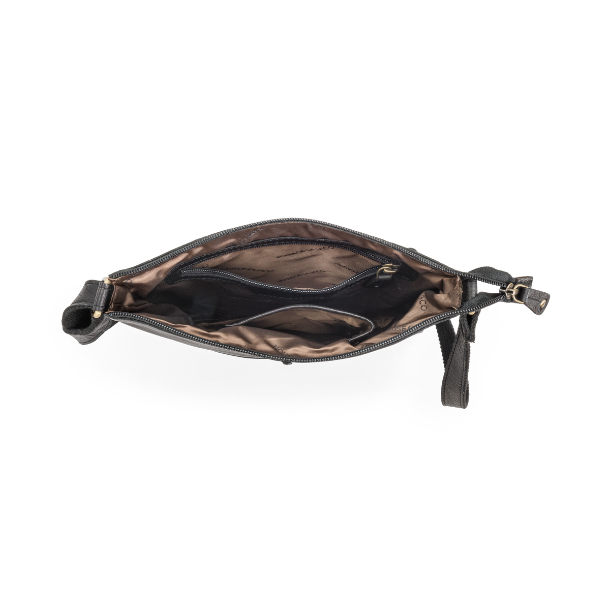 Sisällä vetoketjutasku ja pieni avotasku. Takana vetoketjutasku. Pitkä säädettävä nahkainen hihna.