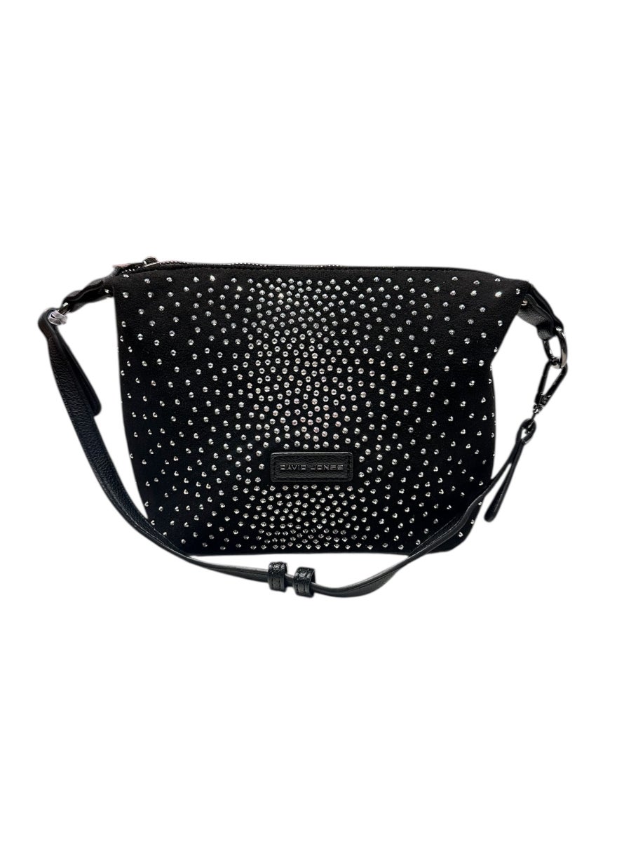 Tällä voit mennä juhlavampaankin tilaisuuteen sillä laukku on koristeltu timanttimaisilla koristekivillä jotka kimmeltävät valossa näyttävästi. Laukku on edestä mustaa mokkanahkamaista keinonahkaa ja takaa sileää "tavallista" keinonahkaa.