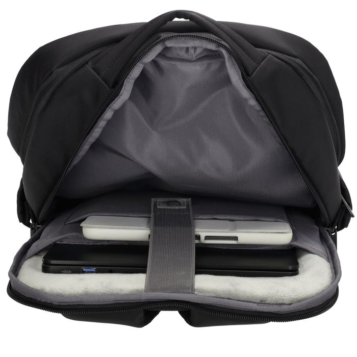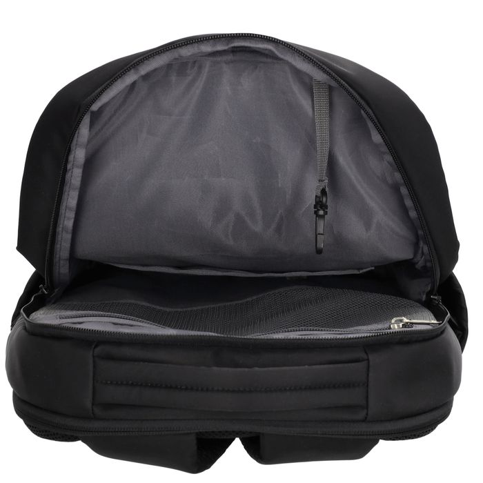 Tyylikäs reppu jossa hyvät osastot ja taskut tavaroille. 15"-tietokoneelle on oma topattu vetoketjutasku selkää vasten. Tilavan päätilan sisällä iso vetoketjutasku sekä pikkutaskuja. Edessä vielä kaksi erikokoista tilavaa vetoketjutaskua. Takana turvatasku.