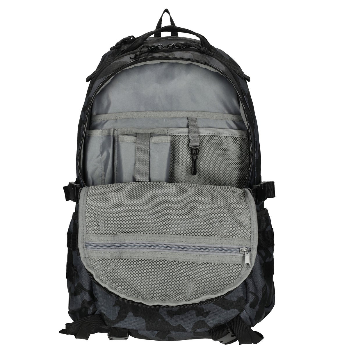 Ergonominen "military"-tyylinen reppu useilla taskuilla ja monipuolisilla varusteilla. Edessä on kätevät nauhat ("molle"-kiinnitys) johon saa tavaroita roikkumaan halutessaan, kuin armeijatyyliin. Korkeussäädettävä rintaremmi lisää ergonomiaa pehmustettujen olkaimien ja selkäosan lisäksi. Päällä kantokahva. Sivuilla ja pohjassa kompressioremmit joilla repun kokoa saa helposti muokattua.