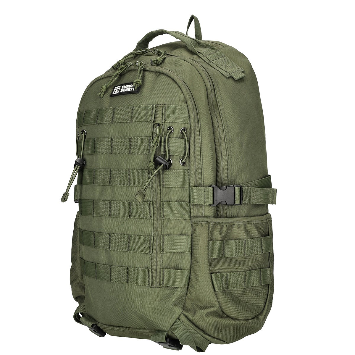 Ergonominen "military"-tyylinen reppu useilla taskuilla ja monipuolisilla varusteilla. Edessä on kätevät nauhat ("molle"-kiinnitys) johon saa tavaroita roikkumaan halutessaan, kuin armeijatyyliin. Korkeussäädettävä rintaremmi lisää ergonomiaa pehmustettujen olkaimien ja selkäosan lisäksi. Päällä kantokahva. Sivuilla ja pohjassa kompressioremmit joilla repun kokoa saa helposti muokattua.
