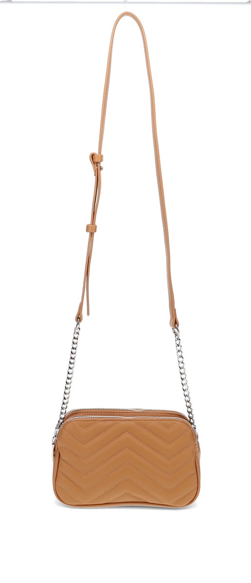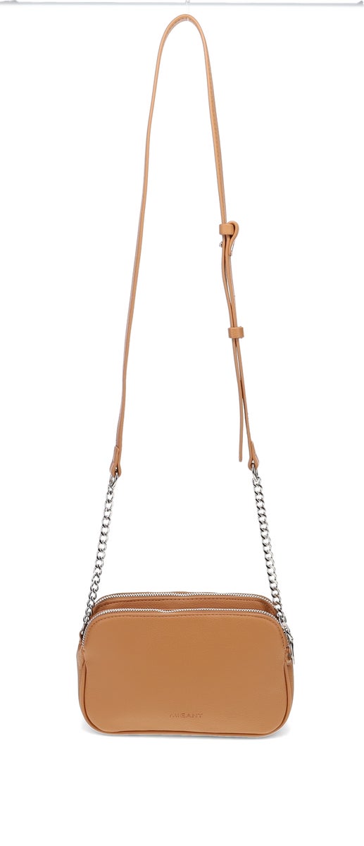 Laukun sisätilat on jaettu kolmeen osaan; kaikki kolme osastoa on vetoketjusulkuisia. Yhdessä osastossa on vetoketjutasku. Vaikka laukku on pieni, mahtuu tähän kaikki tärkeimmät tavarat mukaan organisoituna omille paikoilleen! Mukana tulee pitkä olkahihna jossa ketjuyksityiskohdat. Hihnan pituutta muutetaan ns. vyömäisesti reikien avulla.