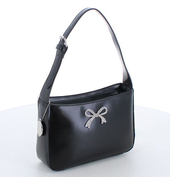 Laukun edessä on sädehtivän kaunis timanttinen rusetti, muuten laukku on kiiltävä keinonahkainen. Tämä laukku sopii niin juhliin kuin vapaa-aikaan.