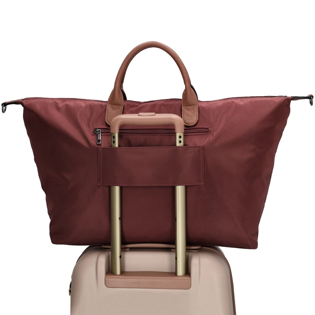 Lisäksi takana aisapaikka jonka avulla kassia saa helposti kuljetettua matkalaukun päällä. Kevyt kuin mikä!