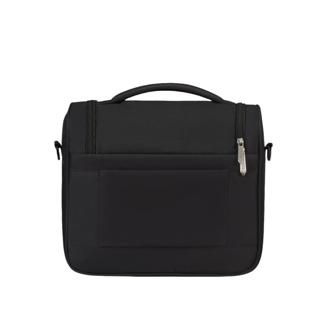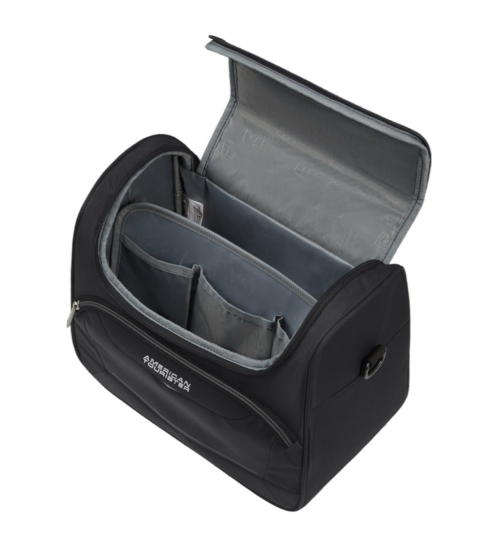 Tässä laukussa on hyvät tilat tavaroiden organisointiin! Kansi avautuu hyvin helpottaen tuotteiden näkymistä. Sisällä on tilanjakaja jonka saa halutessaan myös irti kätevästi neppareilla. Tilanjakajassa on 3 pientä avotaskua ja kuminauhakiinnitykset neljälle pikkutuotteelle. Lisäksi laukun edessä ulkona on vetoketjutasku.