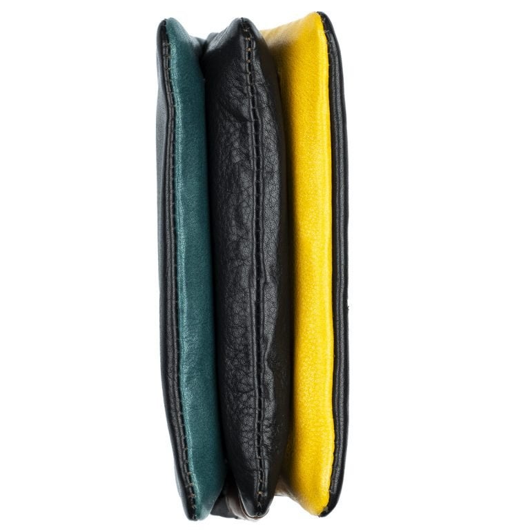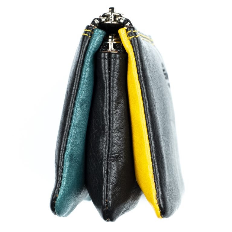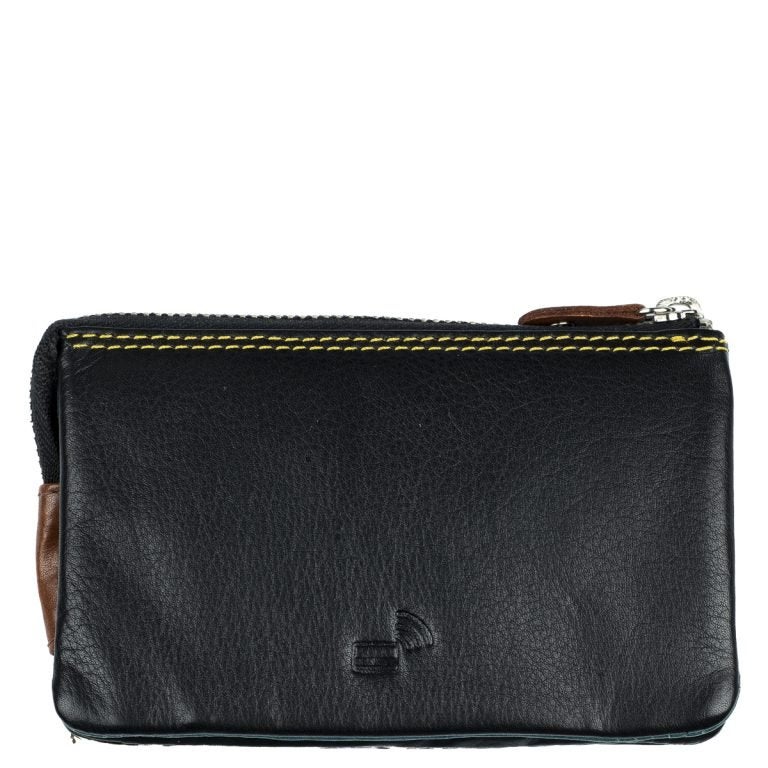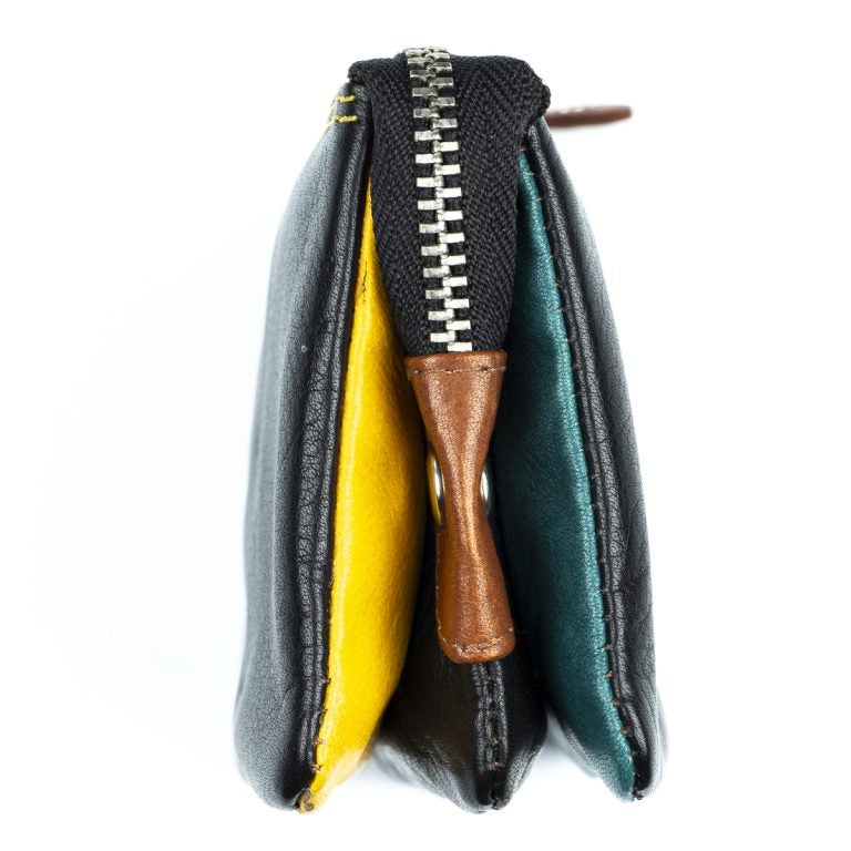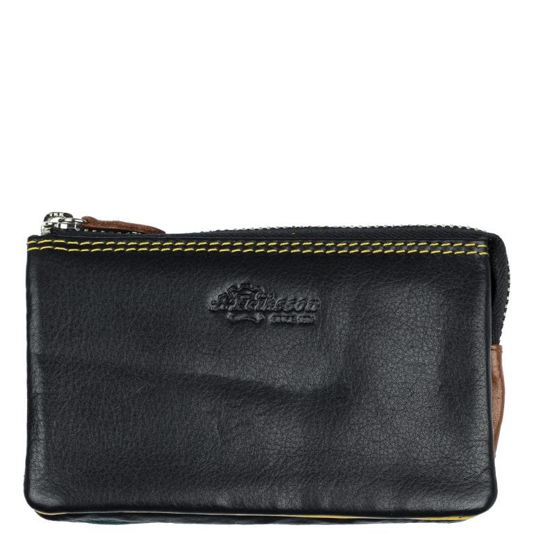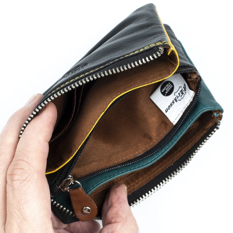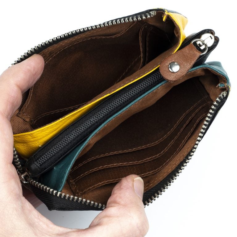 Tämä nahkainen pussukka on jaettu päävetoketjun alla kolmeen osioon; kahdessa on korttipaikkoja ja vapaata tilaa esim. käteiselle, keskimmäinen osio on vetoketjusulkuinen, hyvä paikka kolikoille.