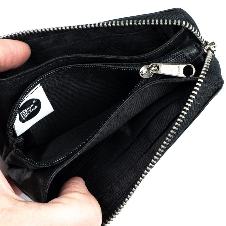 Tämä nahkainen pussukka on jaettu päävetoketjun alla kolmeen osioon; kahdessa on korttipaikkoja ja vapaata tilaa esim. käteiselle, keskimmäinen osio on vetoketjusulkuinen, hyvä paikka kolikoille.