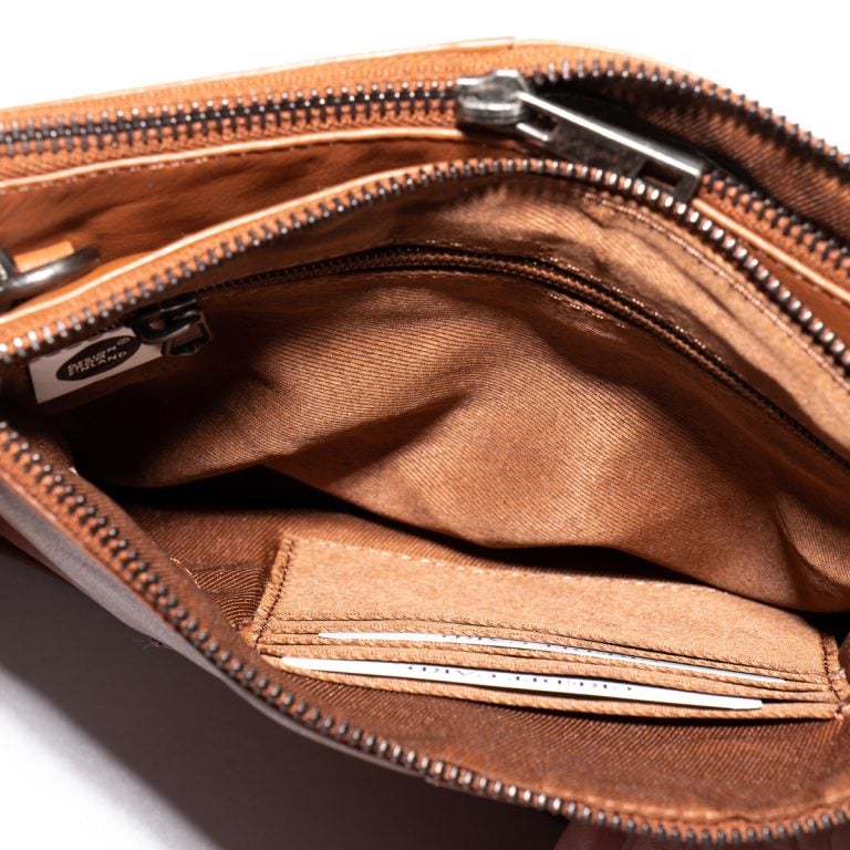 Laukun sisätilat on jaettu kahteen vetoketjuosioon sekä niiden välissä olevaan magneettisulkuiseen taskuun. Sisätiloissa on vetoketjutasku, avotasku esim. puhelimelle, kahteen kynäpaikkaan sekä viiteen korttipaikkaan. Tähän laukkuun saa organisoitua siis kaikki tavarat omille paikoilleen.