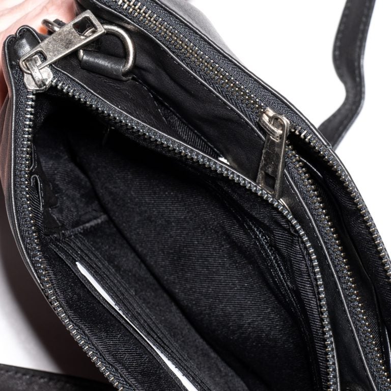 Laukun sisätilat on jaettu kahteen vetoketjuosioon sekä niiden välissä olevaan magneettisulkuiseen taskuun. Sisätiloissa on vetoketjutasku, avotasku esim. puhelimelle, kahteen kynäpaikkaan sekä viiteen korttipaikkaan. Tähän laukkuun saa organisoitua siis kaikki tavarat omille paikoilleen.