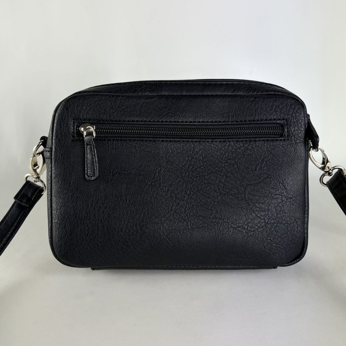 Laukun sisällä on avotasku sekä vetoketjutasku. Takana vetoketjutasku pikkutavaroille. Vaikka tämä laukku ei kyllin iso ole, mahtuu tähän mukaan kaikki tarvittava; puhelin, lompakko, avaimet ja muuta pientä tavaraa.