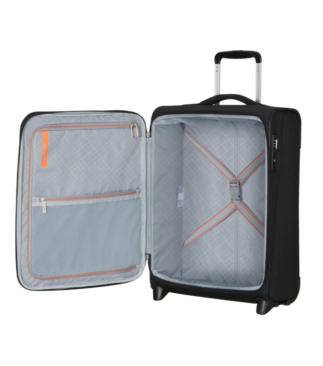 American Touristerin kaksipyöräinen Wanderlite 55cm cabinlaukku on tilava vaihtoehto kaikenlaisille matkoille. Koonsa puolesta (55x30x20cm) matkalaukku käy myös lentoyhtiöiden cabin mitoitukseen, esim. Ryanairin.