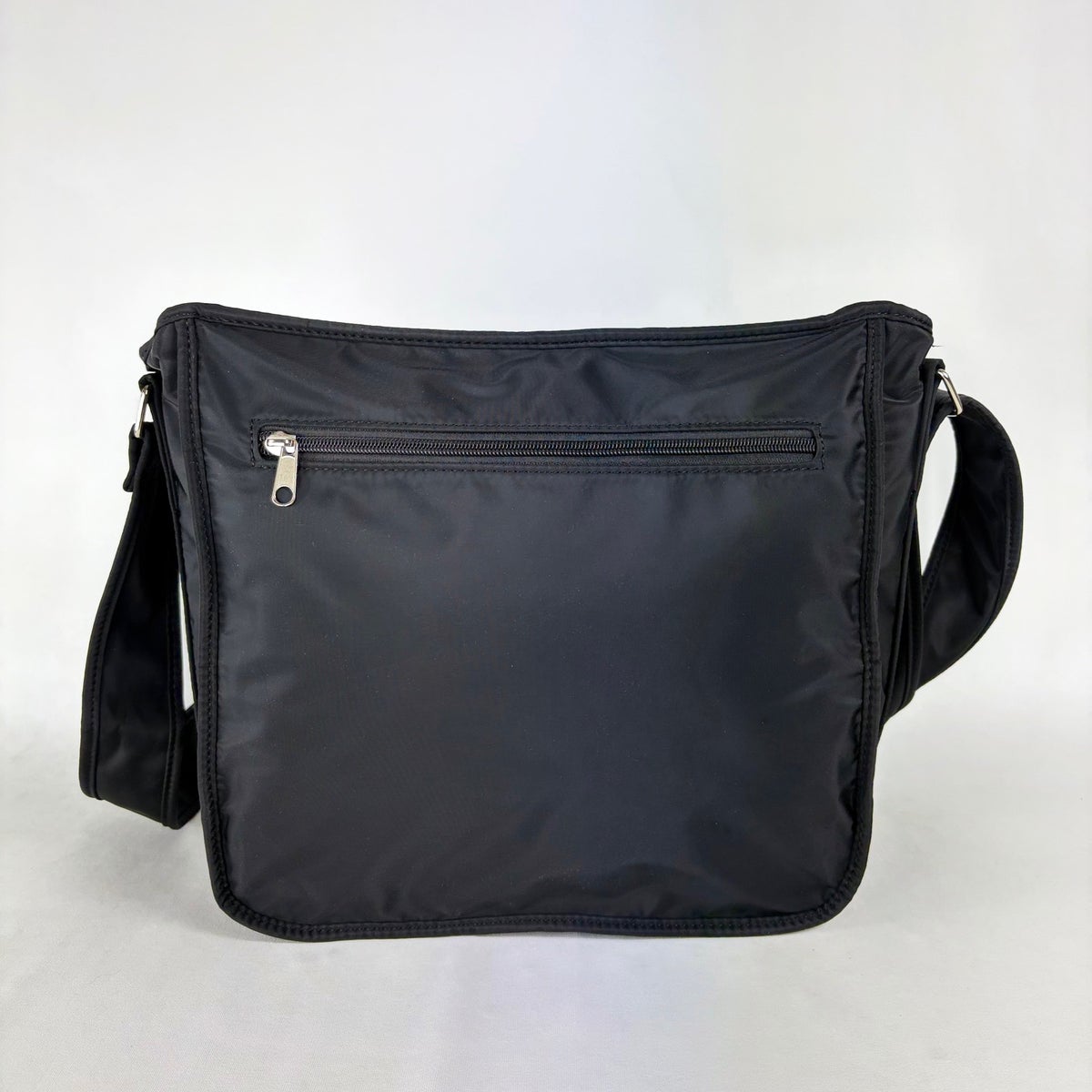 Läpän alla on läpinäkyvä paikka johon saa esim. osoitetiedot sekä kaksi avotaskua. Laukku sulkeutuu läpällä sekä vetoketjulla. Säädettävä pitkä hihna.