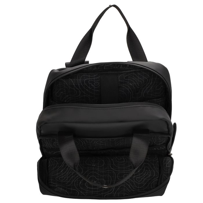 Reppuun mahtuu 14"-tietokone jolle on oma tasku päätilan sisällä. Repun edessä on vetoketjuosasto jossa on erikokoisia avotaskuja. Edessä sekä takana vetoketjutaskut. Molemmilla sivuilla laajennettavat pienet pullotaskut.
